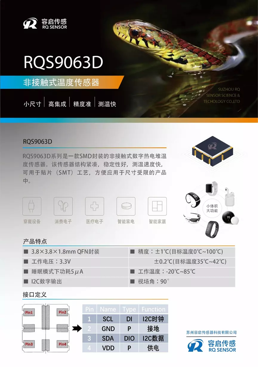 新技术革命的到来,世界开始进入信息时代。在利用信息的过程中,首先要解决的就是要获取准确可靠的信息,而传感器是获取自然和生产领域中信息的主要途径与手段,没有众多的优良的传感器,现代化生产生活也就失去了基础。目前传感器国际格局由美、日、德等企主导市场,国内企业竞争力弱,尚处于快速成长期,中国传感器市场70%左右的份额被外资企业占据。 爱游戏长期致力于国产智能传感器的研发与经营,努力提升自身核心竞争力,尤其在热相关的技术服务与开发,目前非接触测温领域取得了一定成果突破,近来推出的非接触式红外温度传感器RQS9063D能够有效助力穿戴、耳机等行业伙伴企业实现更智能的体温检测健康功能。如今穿戴产品已经走到了智能健康时代,今年最新发布的苹果Apple Watch Series 8, 三星Galaxy Watch 5,华为Watch GT3 Pro,小米Watch S1 Pro, 荣耀的EarBuds 3 Pro耳机及助听器都增加了体温检测功能作为特别卖点,体温检测功能正由各头部企业引领,渐成为穿戴、耳机产品标配的趋势。 产品介绍: 容启RQS9063D非接触式温度传感器 典型应用电路: RQS9063D系列非接触式数字热电堆温度传感器,包括一个红外传感器(热电堆)和一个内建的传感器信号调理芯片,可以通过I2C接口连接到任何微控制器,这个微控制器可以方便获取ADC值和校准参数来计算温度结果。 应用领域: RQS9063D温度传感器可应用于可穿戴设备(智能手表、智能手环、智能耳机)、消费电子、医疗电子、智能家电、智能家居系统等,针对人体温度范围,可实现高精度温度测量。 容启传感 关于容启 爱游戏成立于2015年,公司坐落于苏州纳米城工业园区,是一家专注于各类智能传器设计、研发及应用解决方案的供应商企业。 公司具有优秀的研发能力,核心研发团队拥有近20年的传感器开发经验及顶尖技术专利积累。公司技术开发人员直接对接客户支持,能够快速响应客户的各类需求,迭代更新,一切以客户利益为本。 苏州容启业务细分领域主要涉及红外非接触式测温、热式流量传感、气体传感、封装热测试系统等。在核心业务非接触式测温领域,经过多年的红外热电堆技术沉淀,持续推出体温、耳温检测方案,相关非接触式温度传感器产品具备批量生产供货能力,能够有效助力穿戴、耳机等行业伙伴企业实现更智能的体温检测健康功能。 苏州容启一直秉持自主创新、专业专注、质量第一、用户至上的核心发展理念,致力于为客户提供专业的、高性价比的解决方案,努力成为国际一流的智能传感器服务供应商。